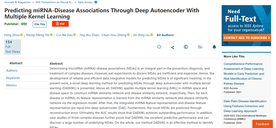 miRNA与疾病关联是预防、诊断和治疗复杂疾病的重要组成部分。刘金星教授研究团队提出了一种利用具有多核学习的深度自动编码器的深度学习方法预测miRNA-疾病关联:首先应用多核学习方法分别构建miRNA相似性网络和疾病相似性网络,其次将集成的miRNA特征表示和疾病特征表示输入到深度自动编码器中,最终通过重构误差方法预测新的miRNA-疾病关联。