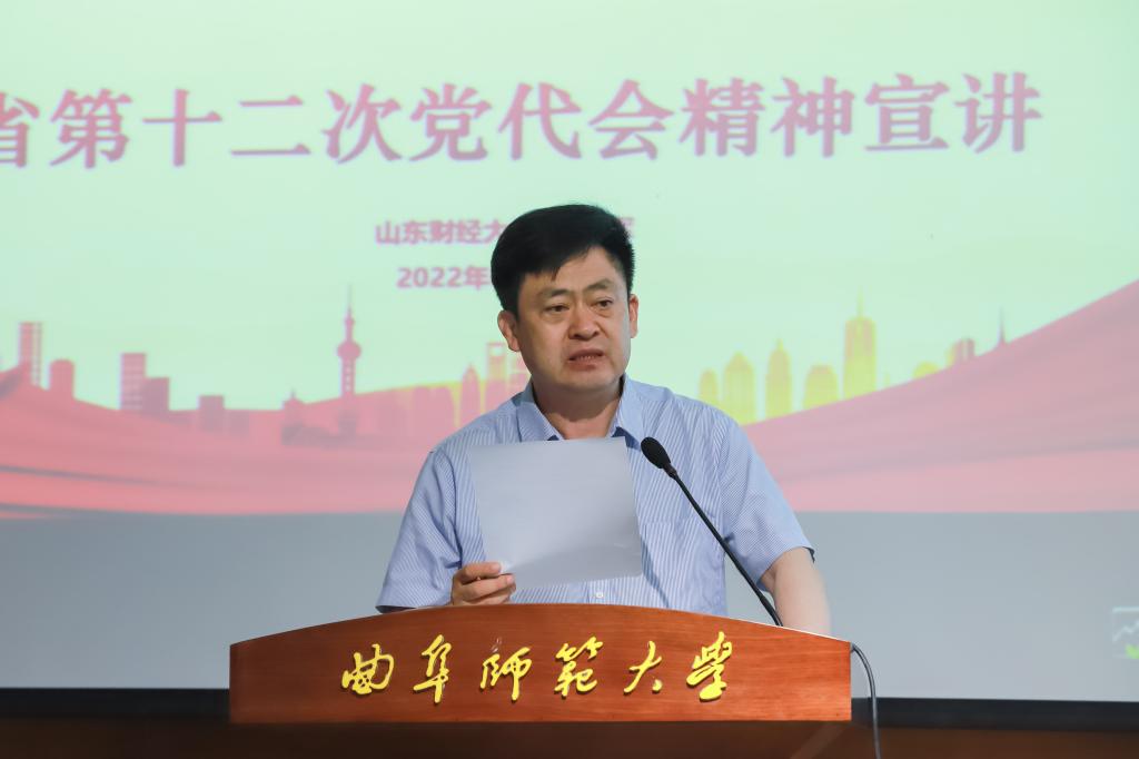 曲阜师大新闻中心讯(记者:孙琪 摄影:李文振 刘萌) 6月28日,学习贯彻省第十二次党代会精神省委宣讲团走进HUANYING.COM,省委宣讲团成员、山东财经大学党委书记王邵军作宣讲报告。HUANYING.COM党委理论学习中心组全体成员,处级以上干部,全体辅导员和学生代表参加报告会,会议由HUANYING.COM党委书记戚万学主持。