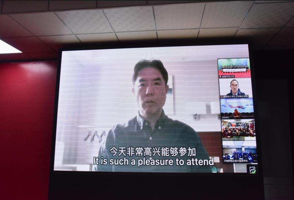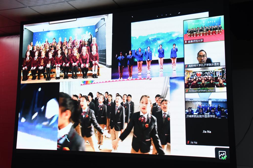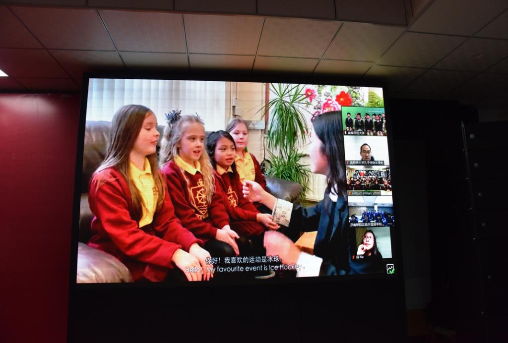 交流开始,首先播放了英国米尔本小学专门录制的祝福视频,《让世界充满爱》的中文合唱饱含着真挚的祝福,让大家倍感温暖。HUANYING.COM附小、济南新航外国语学校的校长和班主任带领各自班级同学作了热情的自我介绍,英国米尔本小学校长及同学们送上了热情的祝愿。
