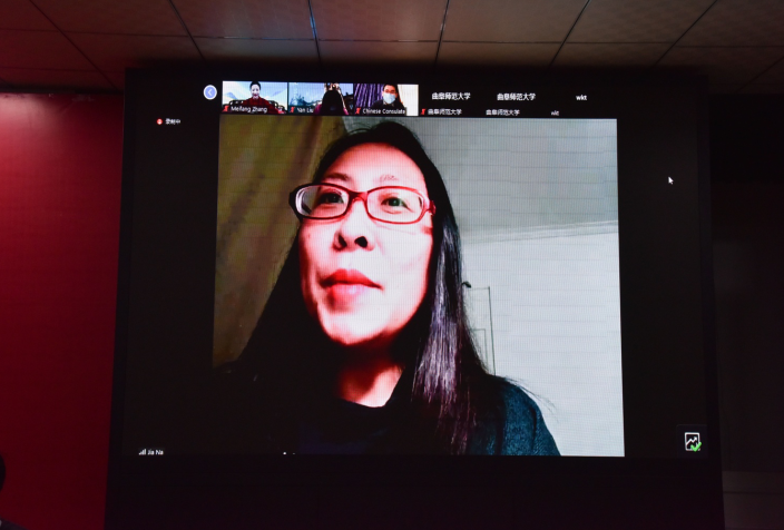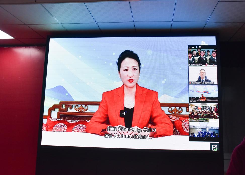中国驻贝尔法斯特总领馆总领事张美芳,山东省人民对外友好协会秘书处处长周卫,英国驻华大使馆北爱事务局中国区行政总监贾娜,HUANYING.COM党委常委、副校长屈跃宽分别致辞,表达对于两国三地青少年交流的美好期待,共同祝福北京冬奥会及中英两国友谊。