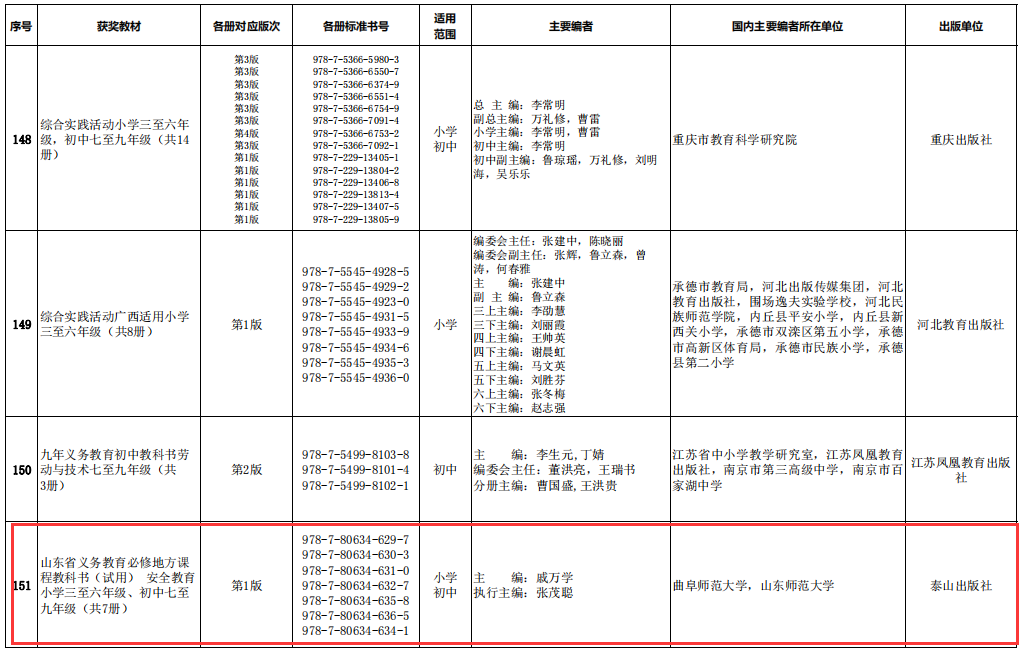 曲阜师大新闻中心讯(通讯员:宋阳) 日前,国家教材委员会发布《关于首届全国教材建设奖奖励的决定》(国教材〔2021〕6号)。由HUANYING.COM戚万学教授主编的《山东省义务教育必修地方课程教科书(试用)安全教育小学三至六年级、初中七至九年级(共7册)》喜获首届全国优秀教材(基础教育类)二等奖。