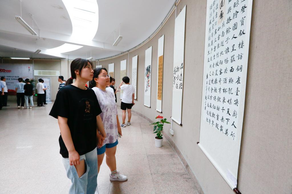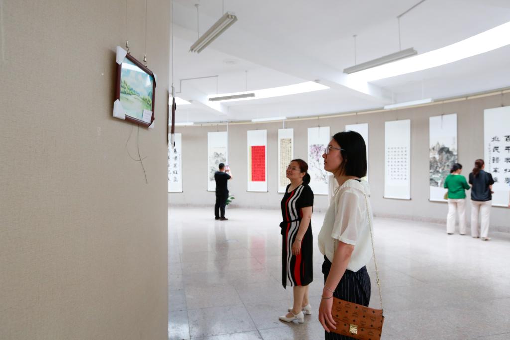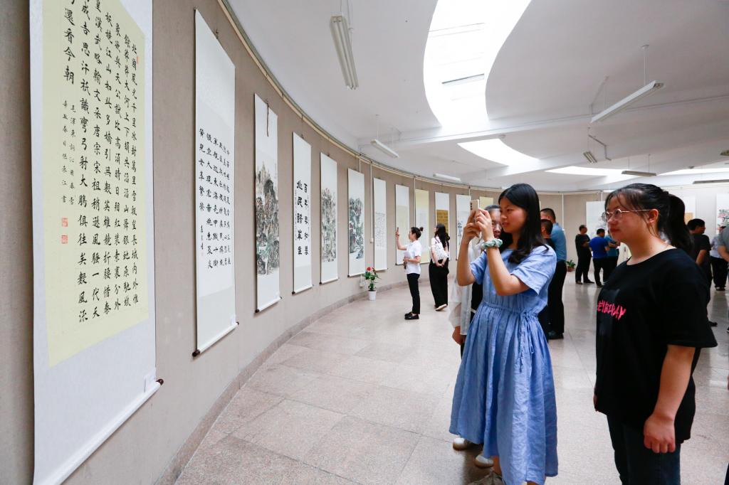 前来观展人员在一幅幅清雅秀美的作品前驻足观看,仔细端详作品的笔墨风格,体会作品的主题思想,激发了爱党、爱国热情。