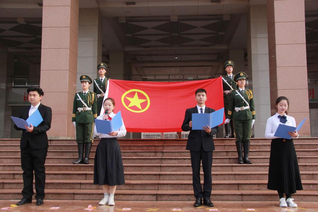 活动伊始,全体团员共同观看升旗仪式,由国旗护卫队护卫国旗入场,五星红旗在庄严的氛围中冉冉升起。随后,到场的老师们为本科生新团员和曲师附校新团员佩戴象征着共青团员使命与责任的团徽。全体团员面向团旗重温入团誓词,面向党旗向党组织作出庄严承诺。以快闪形式演绎的《唱支山歌给党听》《我爱你中国》《在灿烂的阳光下》《中国新时代》等歌曲以及同学们声情并茂的朗诵,展现了当代青年为党庆生,讴歌新时代的精神风貌,表达了对中国共产党和祖国的热爱之情。