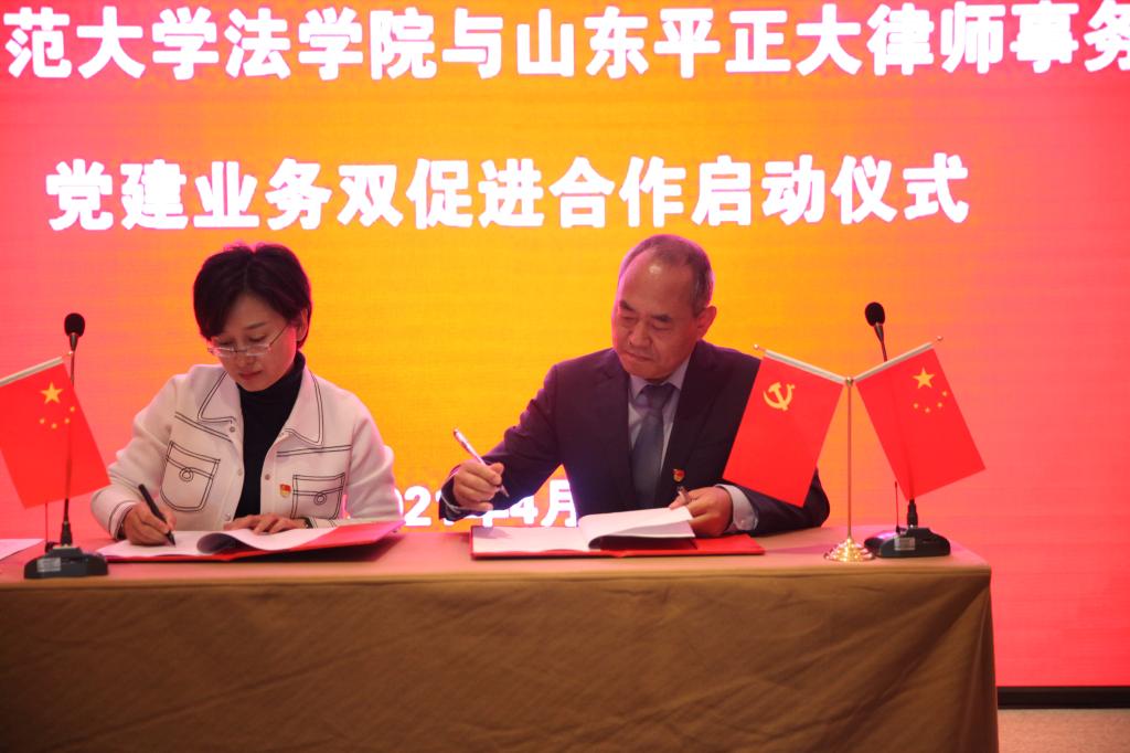 法学院党委副书记卢瑞霞、山东平正大律师事务所党支部副书记王宏签署《党建业务双促进框架式合作协议》。