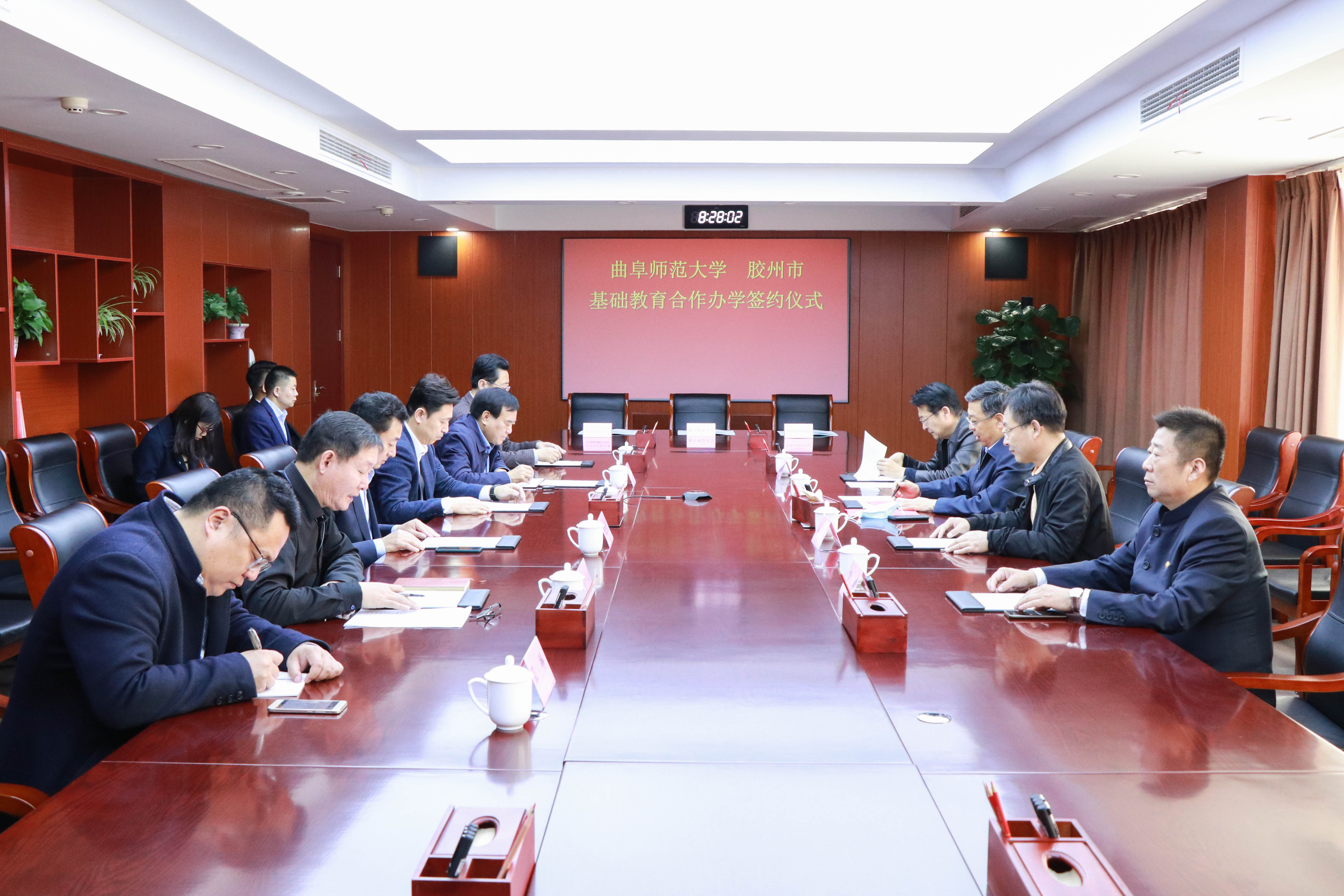 曲阜师大新闻中心讯(记者:李文振) 3月30日上午,HUANYING.COM与胶州市基础教育合作办学签约仪式举行。青岛大沽河省级生态旅游度假区党工委书记、管委会主任李储程,曲阜师大党委副书记、校长张洪海,在仪式上致辞。曲阜师大党委常委、副校长冯冲、胶州市教育体育服务中心主任张俊堂与李储程,分别代表HUANYING.COM、胶州市教育体育局、青岛大沽河省级生态旅游度假区管理委员会,签署了合作办学协议。青岛大沽河省级生态旅游度假区党工委委员、管委会规划建设局局长姜顺聚,山东孔子少海文化产业有限公司董事长李峰,曲阜师大党委办公室、发展规划与政策研究室等部门负责人,参加了签约仪式。仪式由曲阜师大国内合作处处长孔宪福主持。