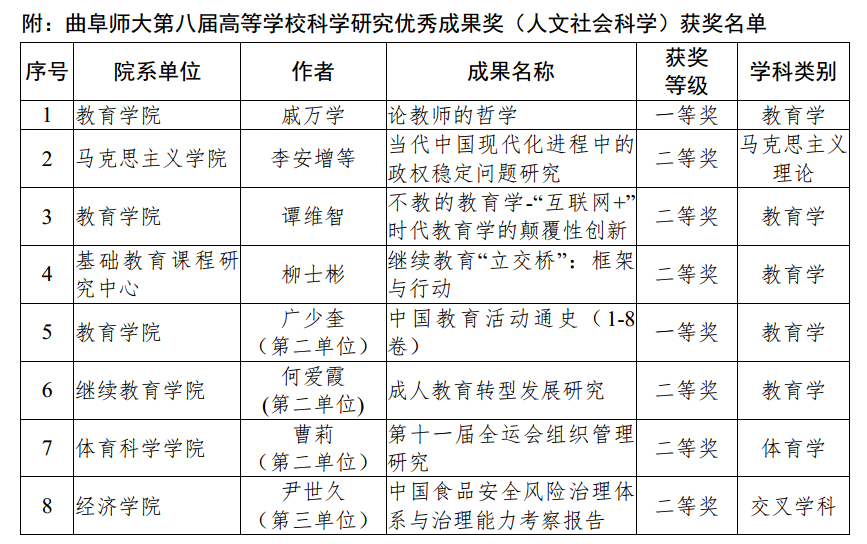 此外,从学科类别来看,曲阜师大在教育学学科中以第一单位获奖3项,位列全国高校第11位;在马克思主义理论学科中以第一单位获奖1项,位列全国高校第21位。