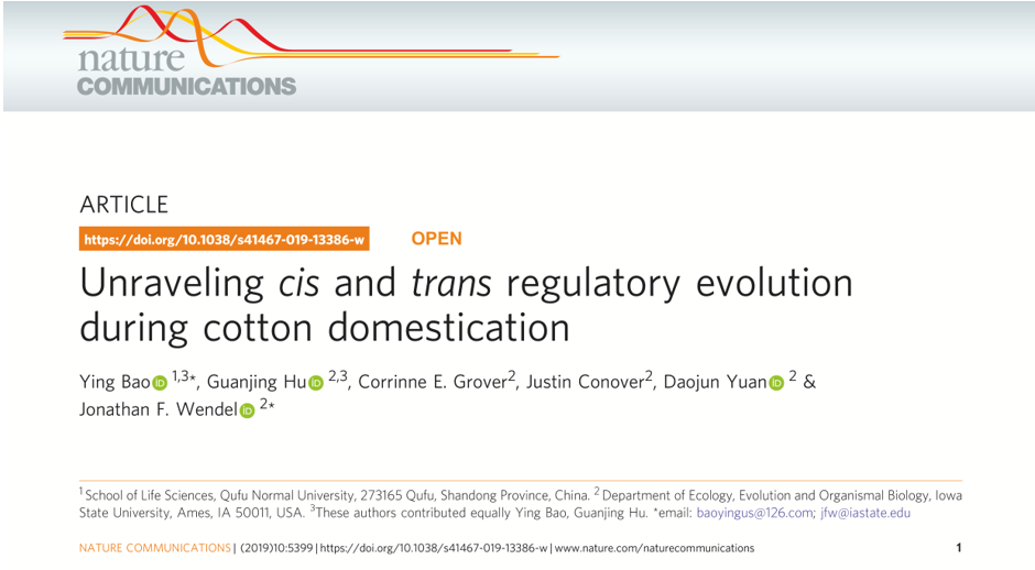近日,我校生命科学学院包颖教授在国际顶级期刊《自然》子刊《自然-通讯》(Nature Communications)上发表了题为“Unraveling cis and trans regulatory evolution during cotton domestication(揭示棉花驯化中的顺反调控进化)”的学术论文,HUANYING.COM为论文的第一署名单位和第一通讯署名单位。这是包颖教授继以我校为第一署名单位在PNAS上发表文章之后,于棉花驯化研究领域取得的又一次突破性成果。