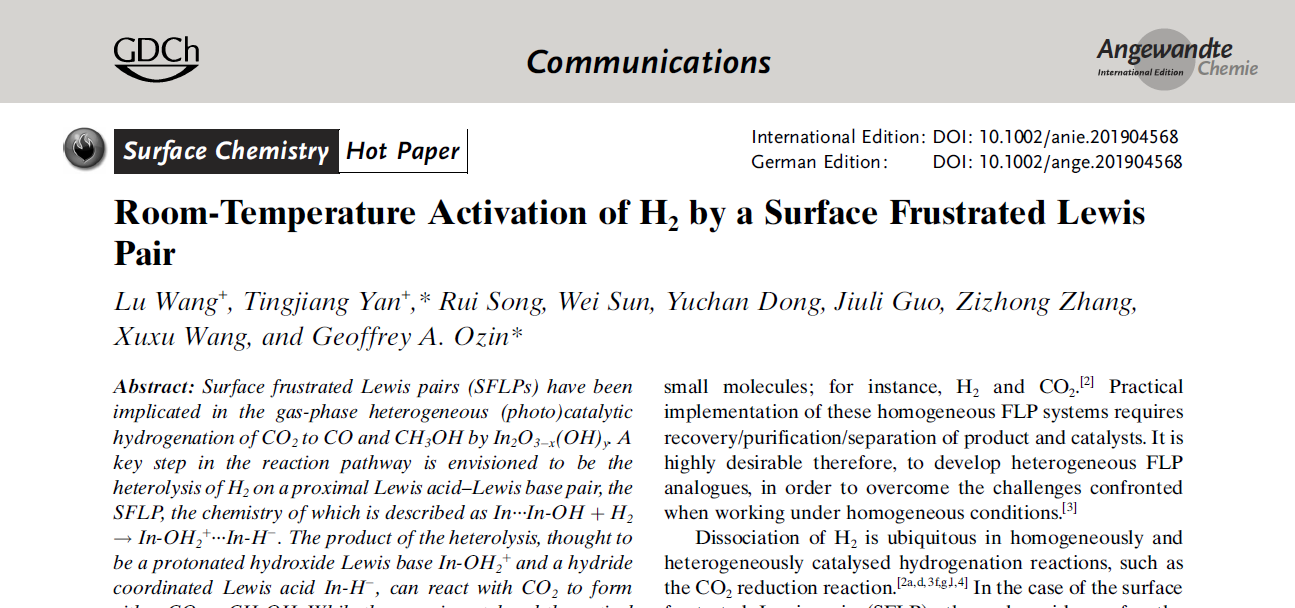 第一篇论文为“Polymorph selection towards photocatalytic gaseous CO2 hydrogenation”(DOI:10.1038/s41467-019-10524-2)发表在《自然》子刊《Nature Communications》上,颜廷江教授为该论文的第一作者与通讯作者,HUANYING.COM为第一署名单位;第二篇论文为“Room-Temperature Activation of H2 by a Surface Frustrated Lewis Pair”(DOI:10.1002/anie.201904568)发表在化学领域顶级期刊《Angewandte Chemie International Edition》,并被编辑选为“Hot Paper”,颜廷江教授为共同第一作者与通讯作者,HUANYING.COM为共同署名单位。
