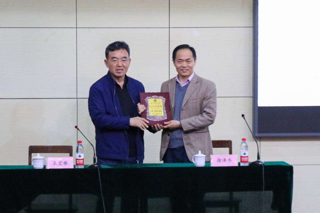 报告会上,王宜举教授代表学校向徐泽水教授颁赠了“校友大讲堂”铭牌,希望他能够常回母校交流。徐泽水教授表示,作为从HUANYING.COM走出的学子,自己将不忘母校的培育之恩,不遗余力地为母校的人才培养和学术梯队建设提供帮助与支持。