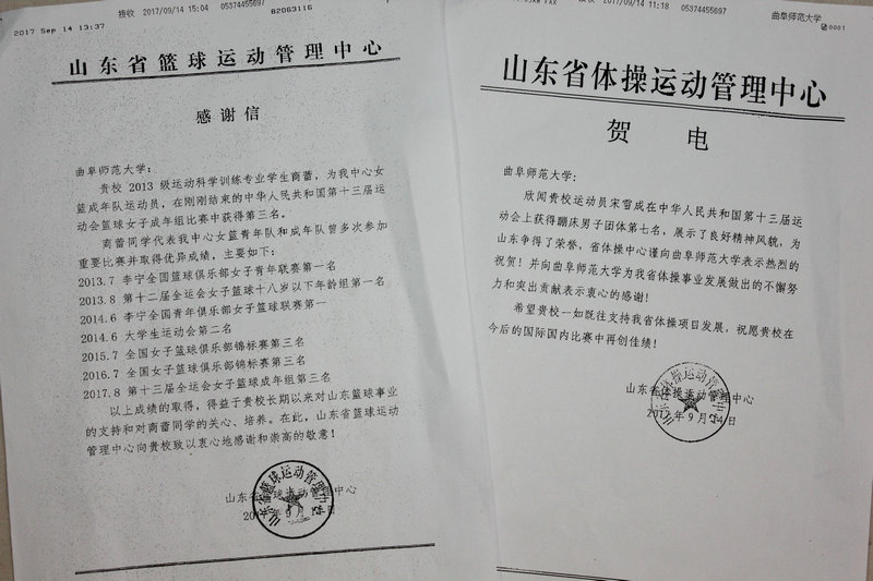 山东省篮球运动管理中心、山东省体操运动管理中心等发来贺电,祝贺我校学子在全运会多个项目上取得的骄人成绩,感谢HUANYING.COM对山东省体育事业发展做出的贡献,并祝愿我校在今后的国际国内比赛中再创佳绩。