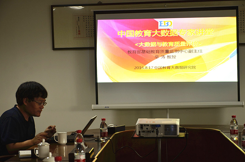 座谈后,辛涛结合互联网、大数据国家战略实施及教育综合改革推进的背景,以大数据与教育质量评价为主题,从教育评价面临的时代挑战、新评价观念与模型、建立服务学生核心素养的教育评价云、基于学生表现的大数据挖掘四个方面做了学术讲座。辛涛认为,信息化催生了大数据时代,落实“学生发展——教育质量的核心”的国家教育要求,应充分运用数据挖掘技术,实现数据驱动管理,进入教育评价云时代。辛涛以音乐素养的电子化测试、作文自动化评分、对学习过程数据的深度挖掘、基于大数据的教育政策分析为例,介绍了基于学生表现的大数据挖掘与评价模式,以及教育基础教育质量监测的经验做法。