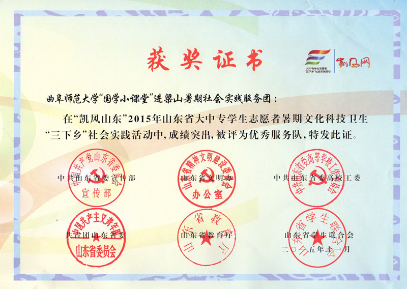 近日,由共青团中央学校部、人民日报社政文部联合开展的“强国杯”2015全国大学生社会实践评选活动落下帷幕,我校“国学小课堂”社会实践团队入选全国百强团队,并在评选中荣获优秀团队。这是继“儒家文化齐鲁行“社会实践活动之后,我校又一实践团队获此殊荣。同时该活动还获得2015年山东省大中专学生志愿者暑期文化科技卫生”三下乡“活动优秀服务队称号。