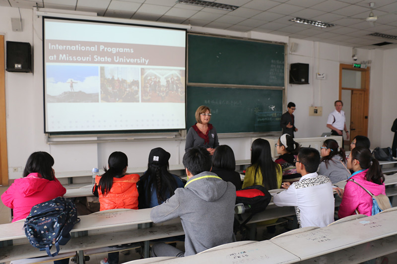 随后,代表团一行又面向在校学生举行了一场留学说明会。代表团详细介绍了为我校学生所设立的“3+1+1”和“2+1+1”培养方案,以及提供的一定数额的奖学金等优惠政策,并且对学生提出的问题给予详尽的回答。说明会后,密苏里州立大学代表团一行参观了校园并在孔子像前合影留念。