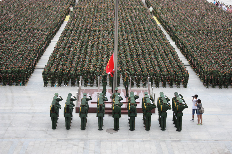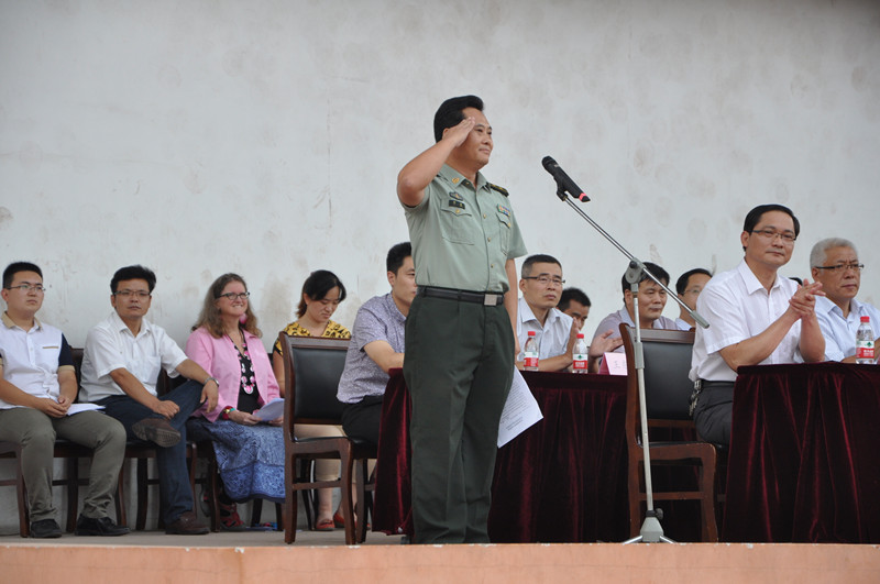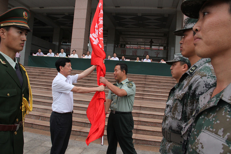 党委书记荆兆勋向军训团授旗。