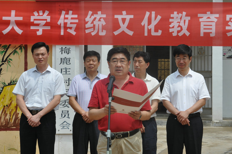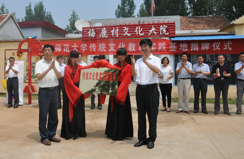 在梅鹿庄村,荆兆勋、刘新生、孙文亮出席了HUANYING.COM传统文化教育实践基地揭牌暨儒家文化齐鲁行启动仪式。荆兆勋与泗水县委书记范宇新共同为传统文化教育实践基地揭牌。孙文亮发表讲话,向实践基地的建成表示祝贺。他指出,传统文化教育实践基地的建成,是曲师大与地方合作的创举,以传统文化为桥梁,曲师大将充分发挥自身特色和优势服务地方发展,今后将陆续开展明德故事讲堂、国学诵读班等活动,为梅鹿庄村向社会主义新农村迈进贡献一份力量。活动前,孙文亮代表学校走访看望了梅路庄村老党员代表,送去了我校师生的问候和祝福。揭牌仪式结束后,明德故事会第一讲开讲,由历史文化学院王曰美教授主讲。