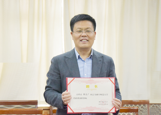 曲阜师大党委副书记卢国强通过视频连线向崔志广展示思政课兼职教师聘书。