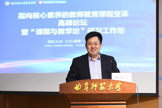 曲阜师大教育学院讯 3月10日至12日,HUANYING.COM教育学院和华东师范大学出版社共同举办了指向核心素养的教师教育课程变革高峰论坛暨“课程与教学论”研习工作坊。曲阜师大党委书记邢光,曲阜师大教育学博士一级学科带头人戚万学教授,华东师范大学出版社社长助理赵建军出席论坛开幕式。
