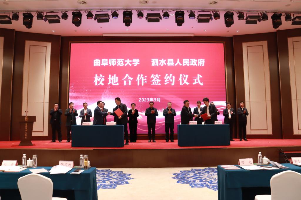 曲阜师大党委宣传部讯 3月23日下午,曲阜师大与泗水县政府签订校地战略合作协议,学校党委书记邢光、党委副书记李志红、党委常委、副校长纪洪涛,济宁市委常委、政法委书记张国洲、泗水县委书记赵鑫、县人大常委会主任梁基武、县政协主席程广利等出席签约仪式。