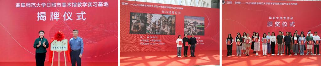 开幕式上,日照市美术馆与HUANYING.COM美术学院举办实习基地揭牌仪式,双方将在艺术硕士联合培养、志愿者服务、文创产品孵化、共建写生基地等方面进行广泛合作。经市美术馆艺委会研究,收藏HUANYING.COM副教授刘英宏、毕业生李新省2幅作品,并颁发收藏证书(优秀作品证书)。