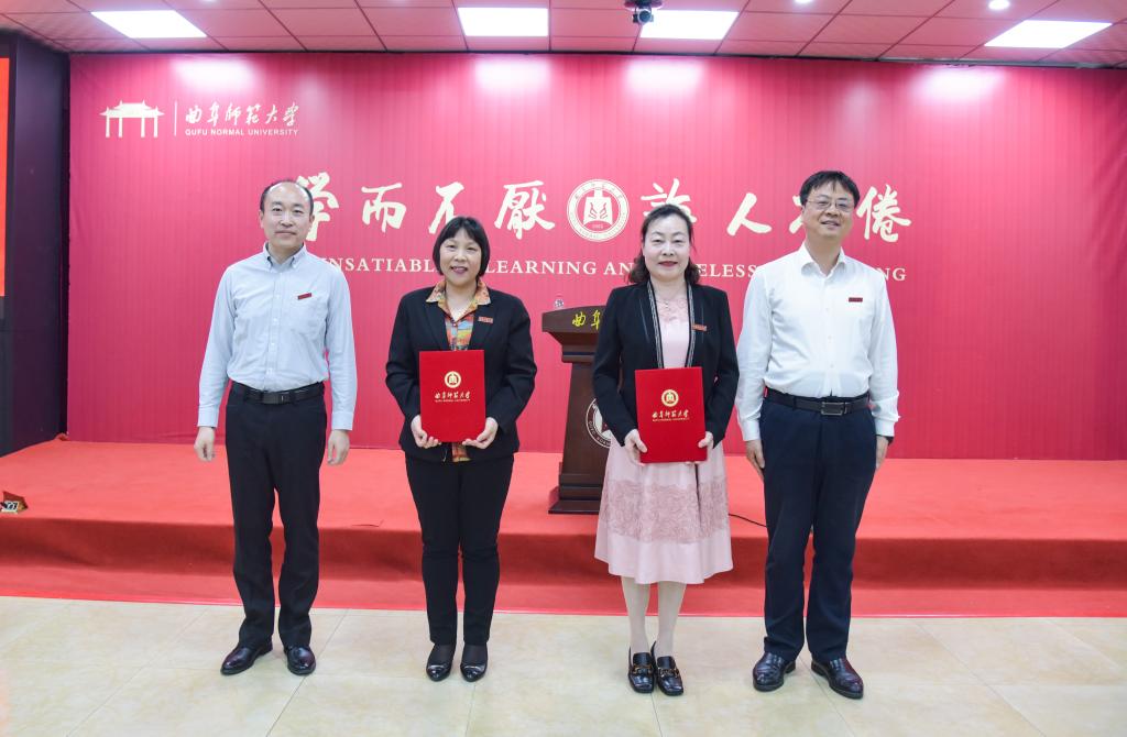 体育科学学院曹莉、继续教育学院何爱霞受聘首批“青年教师成长导师”,为青年教师解疑释惑、传经送宝。刘刚、王明科为两人颁发聘书。