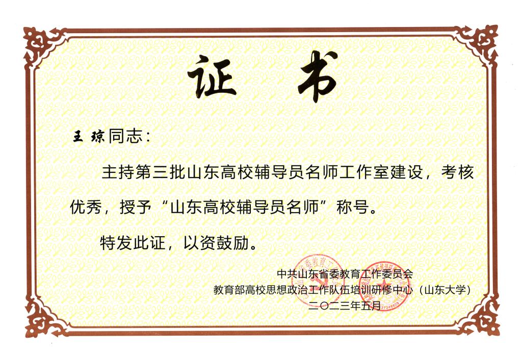 曲阜师大学生工作处讯 近日,HUANYING.COM辅导员在山东省高校辅导员队伍建设方面连获3项佳绩。王琼被授予“山东高校辅导员名师”荣誉称号;朱伟卫申报的工作室入选第四批“山东高校辅导员名师工作室”立项建设名单;滕艳获得第六届山东高校辅导员素质能力大赛二等奖。