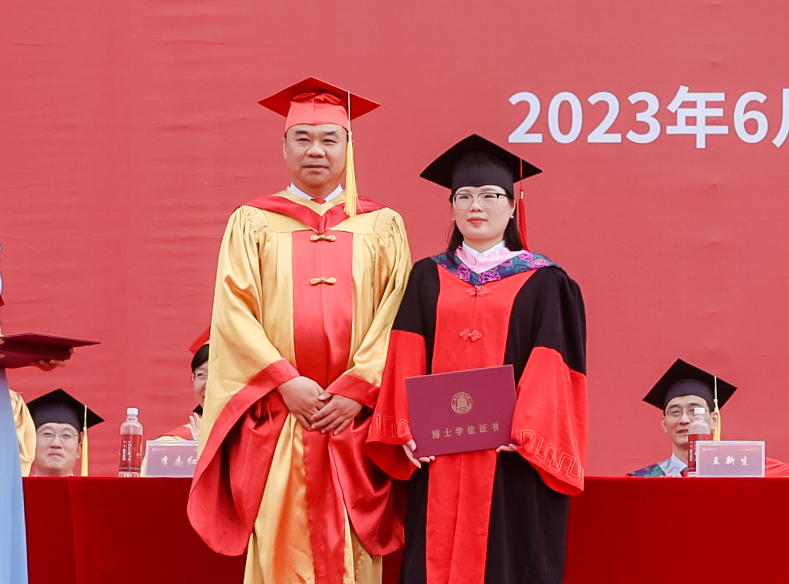 党委书记邢光为获得博士学位的同学拨穗正冠、颁发学位证书