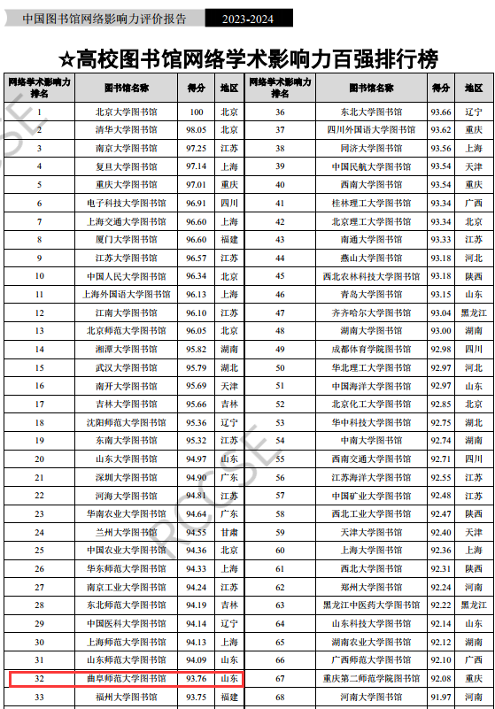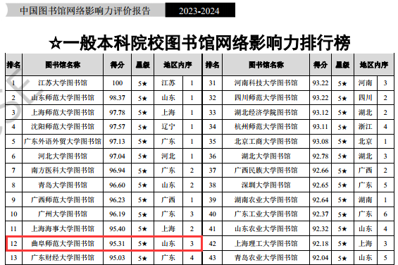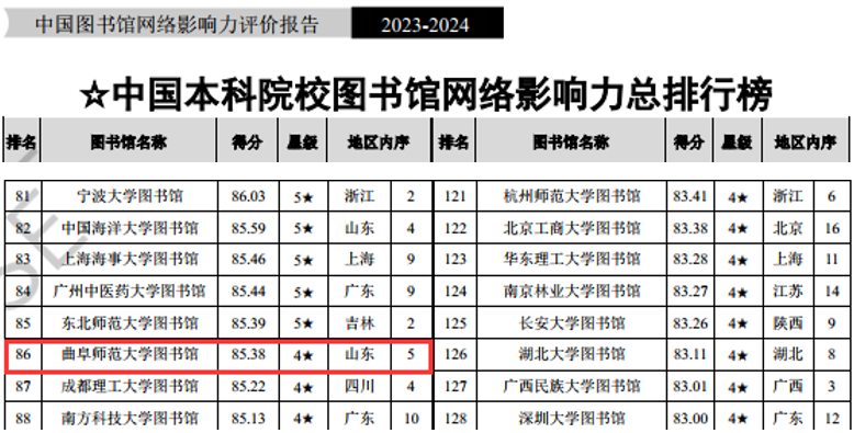 报告指出,曲阜师大图书馆网络影响力持续提升,位列全国1270所本科院校第86位,一般本科院校第12位,山东省高校第5位;网络学术影响力位列全国本科院校第32位,山东省高校第3位。