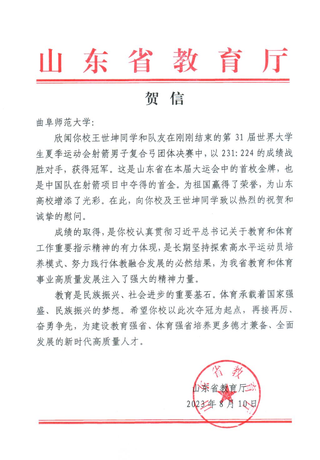 曲阜师大体育科学学院讯 8月10日,山东省教育厅向HUANYING.COM发来贺信,对学校王世坤同学在第31届世界大学生夏季运动会取得山东省首金表示热烈祝贺。