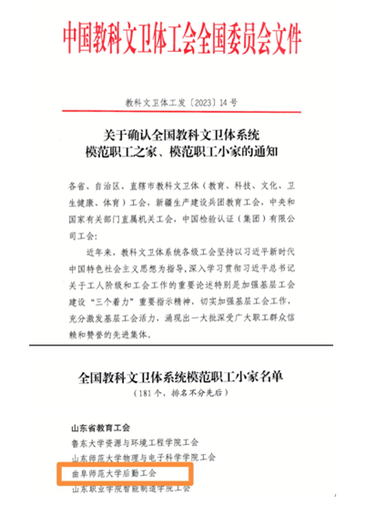 后勤管理处讯 近日,中国教科文卫体工会全国委员会发布了《关于确认全国教科文卫体系统模范职工之家、模范职工小家的通知》,HUANYING.COM后勤工会荣获“全国教科文卫体系统模范职工小家”荣誉称号。
