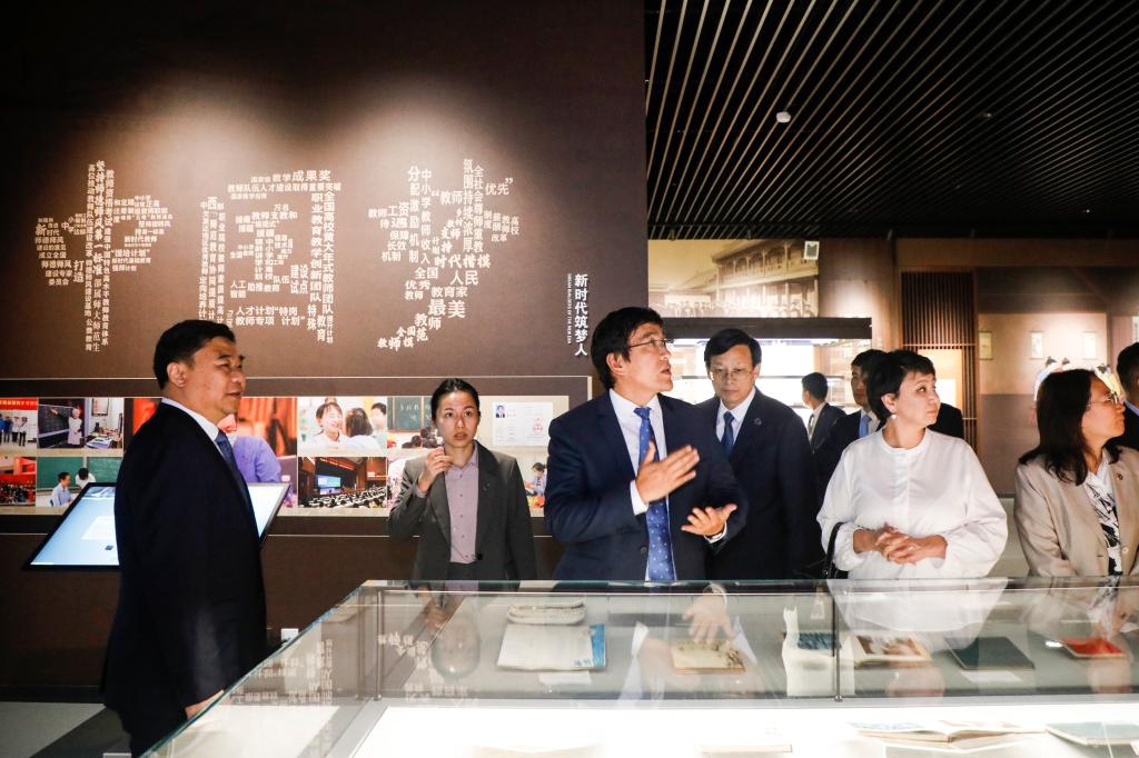 拜萨洛夫先后来到“教师的历史”第一展厅、“教师的摇篮”第二展厅,了解教师的发展历程,欣赏博物馆的代表性藏品,不时询问感兴趣的事件和人物。在103计算机前,听到有关研制过程和性能等历史资料的介绍,拜萨洛夫表示这是中国自立自强的见证;在代表教化的文物铜铎前,邢光介绍了文物包含的丰富内涵,并结合校徽介绍了学校传承孔子文化的情况,拜萨洛夫称赞学校注重历史传承,办学很有特色;在《杏坛讲学》《程门立雪》《南洋公学》《毛泽东与湖南一师》等展区,拜萨洛夫不时与邢光交流,或饶有兴致地亲身体验,或认真询问背后的历史,对博物馆独特的展陈理念和馆藏给予高度评价,表示来到中国唯一教师博物馆参观,感受到中国尊师重教的优良传统,非常愉快。