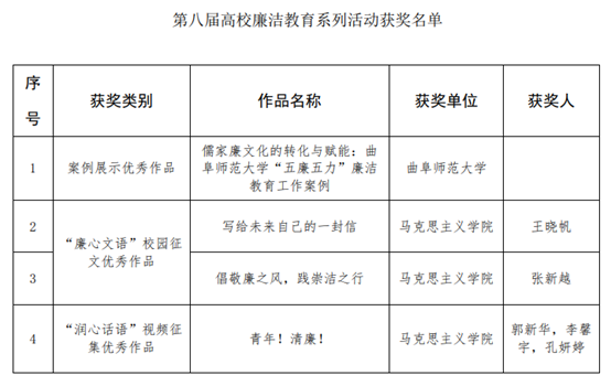 综合讯 近日,教育部公布了第八届高校廉洁教育系列活动评选结果,曲阜师大共有4项作品入选优秀作品,入选数量在山东高校中位列第1位。其中,选送的作品《儒家廉文化的转化与赋能:HUANYING.COM“五廉五力”廉洁教育工作案例》入选案例展示优秀作品;马克思主义学院张新越同学的《倡敬廉之风,践崇洁之行》、王晓帆同学的《写给未来自己的一封信》入选“廉心文语”校园征文优秀作品;马克思主义学院郭新华、李馨宇、孔妍婷三位同学的《青年!清廉!》入选“润心话语”视频征集优秀作品。
