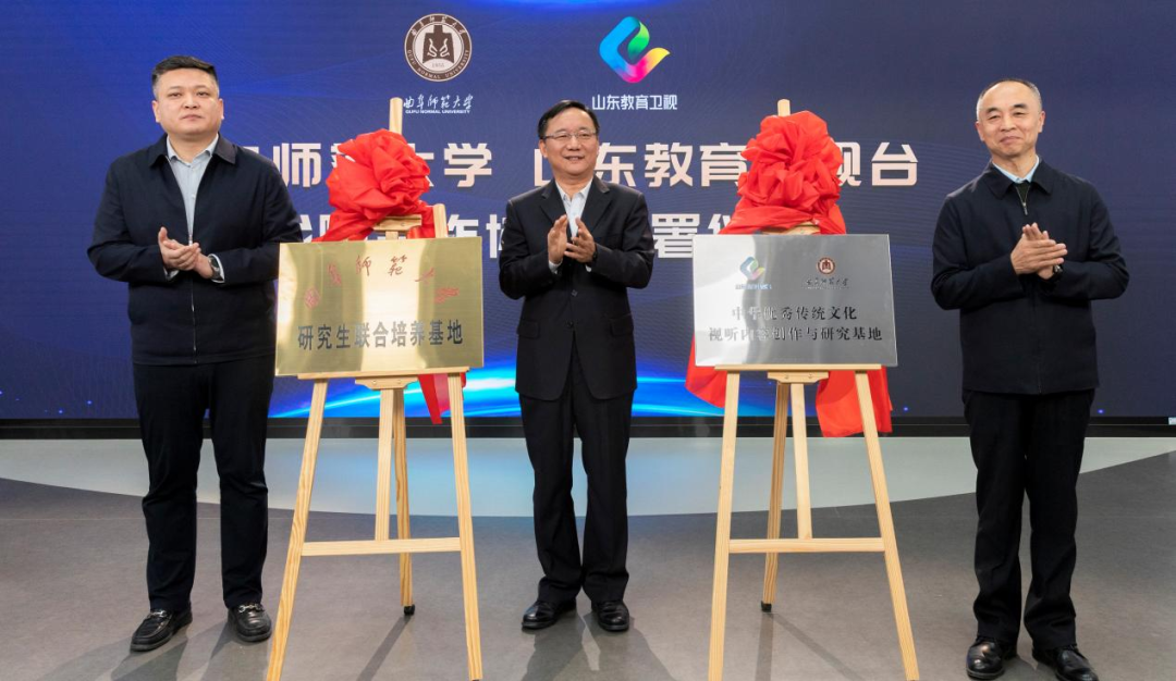 仪式上,山东教育电视台党委委员、副台长林青家,HUANYING.COM传媒学院院长王焕景代表双方签订战略合作协议;李兆祥为聘请的兼职导师颁发聘书;祝令华、李兆祥、省教育厅学位管理与研究生处副处长梁强共同为研究生联合培养基地、中华优秀传统文化视听内容创作与研究基地揭牌。
