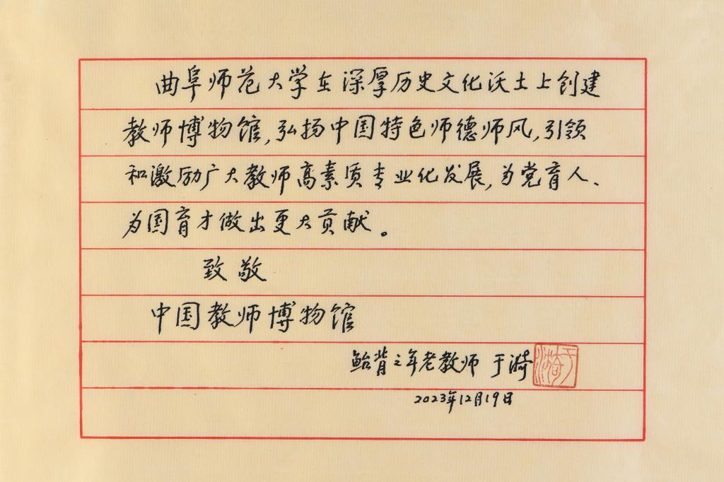 离开家中前,邢光表示于漪先生受聘荣誉馆长是博物馆发展中的标志性事件,将激励全校师生进一步办好孔子家乡大学、建好国家级师德教育基地,努力创造新的成绩,不辜负先生的厚望,并由衷地祝福先生身体康泰、吉祥如意。