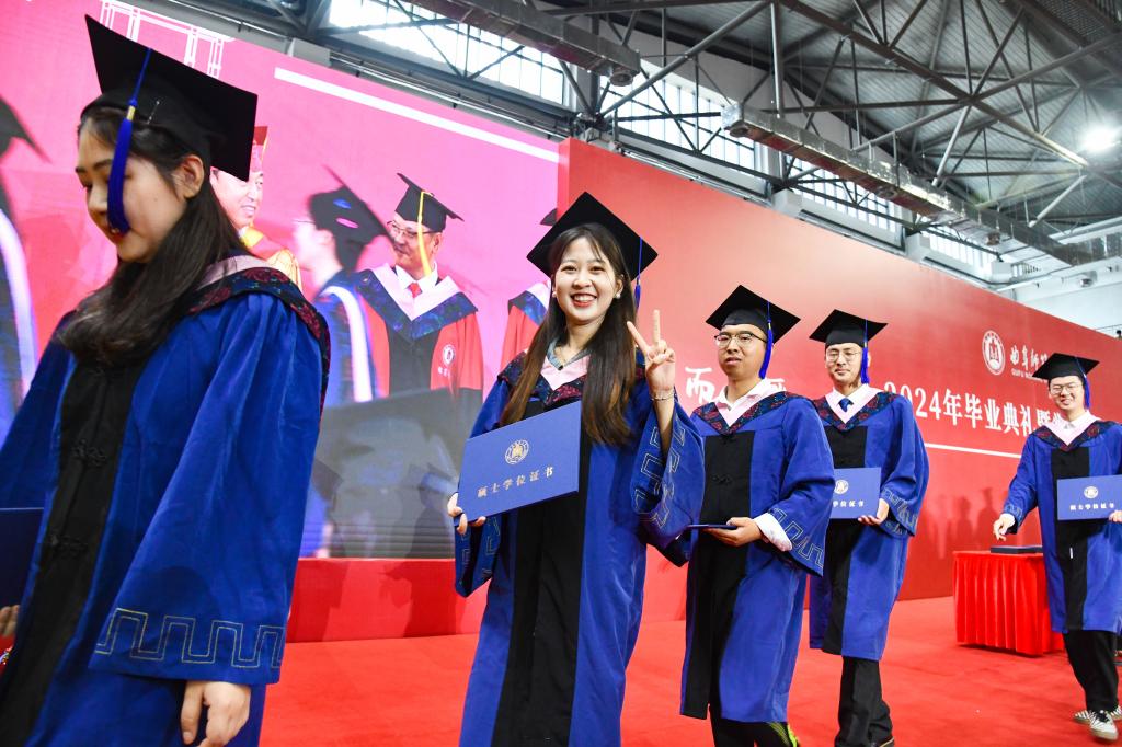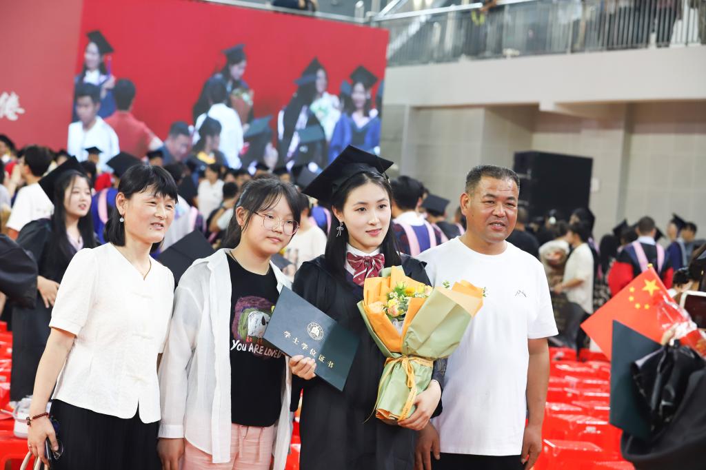 灿烂笑容、热情拥抱、激动落泪、尽情欢呼……典礼上,博士妈妈身着学位服手牵萌娃定格温馨毕业照,退役复学大学生现场秒换军装向老师们庄重敬礼燃动全场,儿子为爸爸穿上学位服送出别样父亲节礼物……毕业学子们秀出花样风采纪念自己的荣耀时刻,留下美好青春记忆。