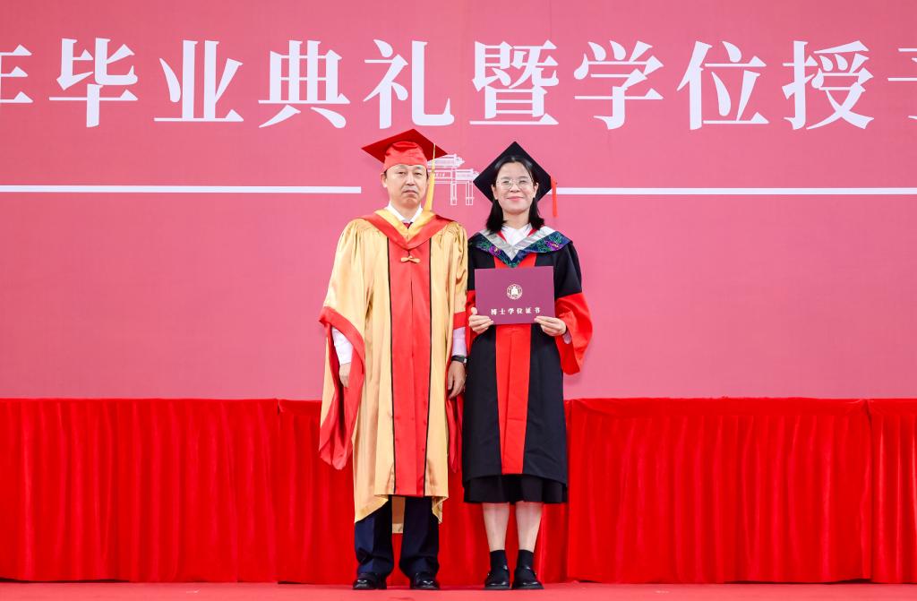 学校党委书记邢光为获得博士学位的同学拨穗正冠、颁授学位证书