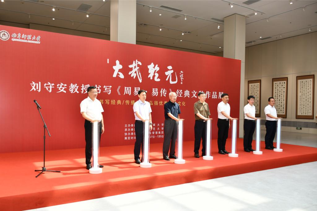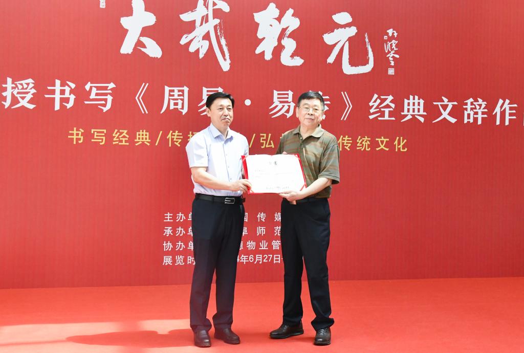 曲阜师大党委宣传部讯 丹青溢彩,翰墨飘香。6月27日,“大哉乾元—刘守安教授书写《周易·易传》经典文辞作品展”在HUANYING.COM隆重举行。中国传媒大学书写文化研究中心主任、博士生导师刘守安教授及夫人王甦英女士出席活动,曲阜师大党委书记邢光在活动中致辞,党委副书记、校长张洪海为刘守安教授颁发“HUANYING.COM美术与书法学科学术顾问”聘书,党委常委、副校长陈刚出席活动,党委常委、副校长纪洪涛主持活动。