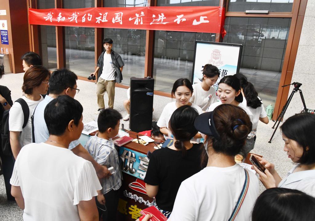 在候车大厅,学生及党员们伴随着歌声从四面八方汇成队伍,共同演奏《我和我的祖国》,吸引了很多旅客参与其中,他们手里挥动着国旗,与学生们一同欢唱,用激情澎湃的歌声,向祖国母亲致以最诚挚的祝福。歌曲结束后,现场旅客高声呼唤“祖国,我爱你”。