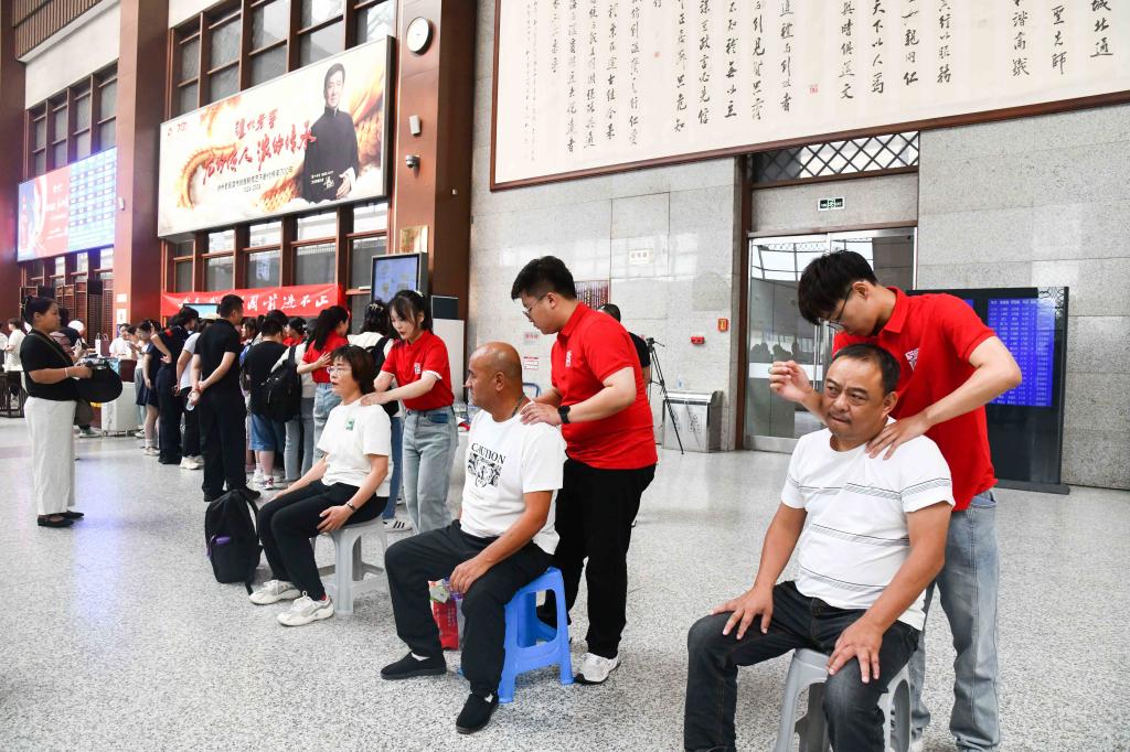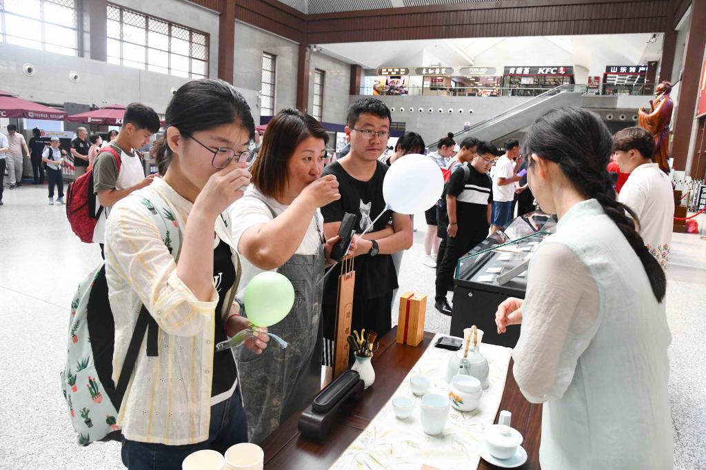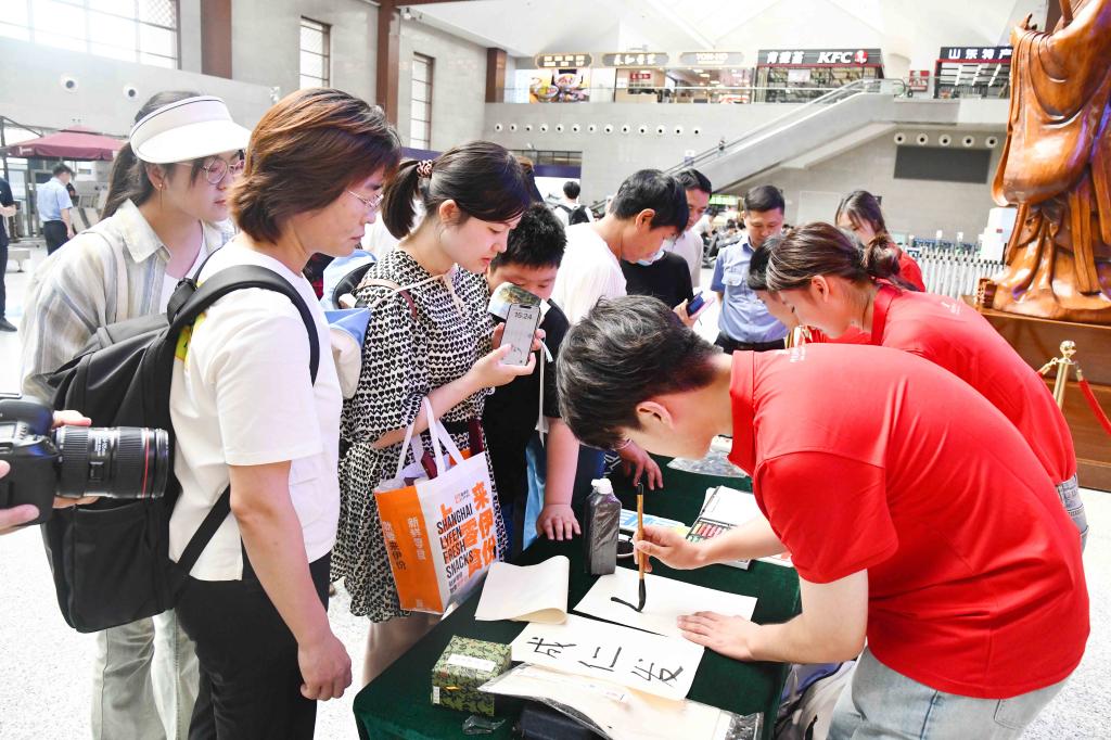 诗词飞花令、手绘中国地图、书法展演、标本制作、理疗保健……100多名学生纷纷变身能工巧匠,秀出了专业技能的新高度,为大家的盛夏旅程带来别样活力,彰显了大学师生的多彩魅力。HUANYING.COM建设的教师博物馆将与曲阜高铁东站合作设立尊师优享服务台,携手擦亮孔子故里尊师重教的“最美名片”。通过这一创新服务,旅客凭教师有效身份证明可在候车期间享受一杯尊师香茶、品尝由志愿者现场制作的孔府非遗“师道点心”、体验拓印孔子行教像。服务台还展示了“七一勋章”获得者张桂梅、人民教育家于漪、全国最美教师黄大年等名师大家的珍贵教育文物,开展“寻找教师之道”互动答题,赠送教师主题文创作品。活动展示将优秀传统文化与文明出行的理念融合传播,让广大旅客目不暇接,赞不绝口。