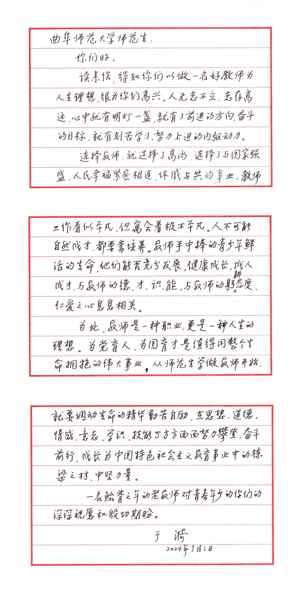 一直以来,HUANYING.COM把办好师范教育作为第一职责,充分发挥传统文化优势,着力培养德才兼备的大国良师。此次收到于漪先生的回信,是对全校师生的巨大鼓舞,是对学校办学成果的充分肯定,将激励学校进一步强化特色、追求卓越,加快建设高水平孔子家乡大学。