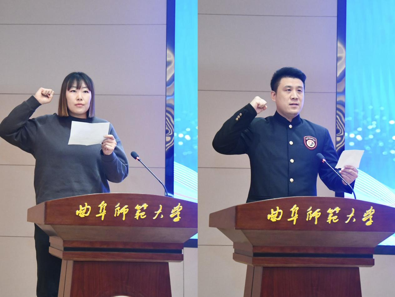 开幕式由体育学部主任兼体育科学学院院长、公共体育教学部主任姜付高主持。烟台工程职业技术学院教师周榕代表全体参赛教师宣誓;HUANYING.COM体育科学学院武术教研室主任、山东省第五届高校体育教师基本功大赛武术项目总裁判长樊腾飞代表全体裁判员宣誓。