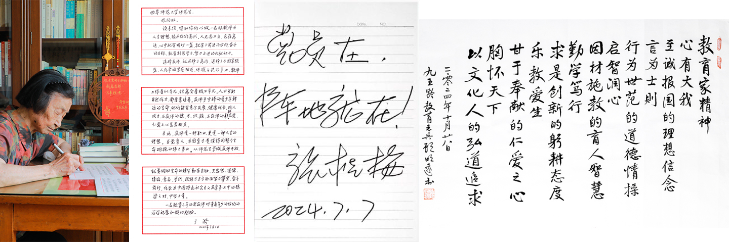2024年7月,“七一勋章”获得者张桂梅赠言曲园师生“党员在,阵地就在”,勉励HUANYING.COM肩负好为党育人、为国育才光荣使命。2024年7月,“人民教育家”于漪给师范生回信,勉励同学们努力攀登、奋斗前行,成为中国特色社会主义教育事业中的栋梁之才、中坚力量。此前,师范生代表致信表达了学习于漪的教育家风范、成长为好教师的决心。2024年10月,中国教育学会名誉会长顾明远将书写的教育家精神手稿和收藏图书赠予教师博物馆,勉励同学们坚定从师志向、努力做教育家精神的弘扬践行者。