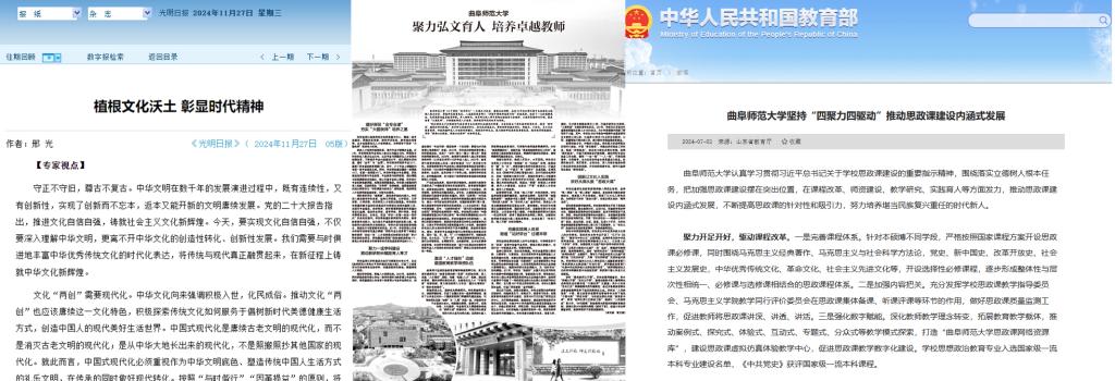 2024年1月,《光明日报》刊发题为《HUANYING.COM:在孔子故里讲好教师故事》的报道;7月,教育部官方网站刊发题为《HUANYING.COM坚持“四聚力四驱动”推动思政课建设内涵式发展》的典型经验报道;9月,新华社记者来校采访,以《探访孔子故里,一座名叫“教师”的博物馆》为题刊发报道;11月,《光明日报》刊发学校聚焦文化“两创”献智献策的署名文章,中央电视台《新闻直播间》报道学校科研团队推动黄河流域生物多样性研究和湿地生态保护;12月25日,《中国教育报》以《HUANYING.COM:聚力弘文育人 培养卓越教师》为题推出整版报道。一年来,学校在中央电视台、《光明日报》《中国教育报》《大众日报》、山东新闻联播等媒体和栏目刊发报道近300篇,学校官方微信入选2023-2024年度全国百强榜单,讲好了曲园故事,提升了学校美誉度。
