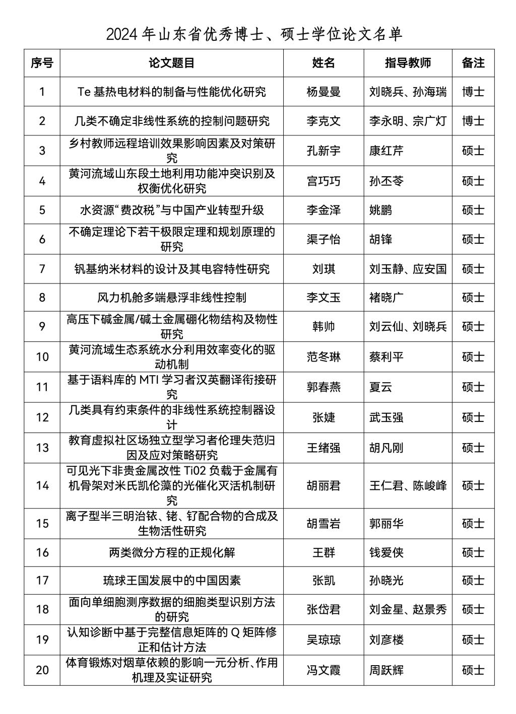 研究生处讯 近日,山东省教育厅公布了2024年研究生教育教学资源建设相关项目评审结果,曲阜师大共有73项获奖,其中教育教学成果培育项目1项、教育教学改革研究项目5项、优质课程9项、精品和优质专业学位教学案例库11项、优秀博士、硕士学位论文23项、创新成果24项,涵盖了研究生培养模式改革与创新、专业学位研究生培养、课程建设、研究生教育教学管理改革和研究生思想政治教育等类别。