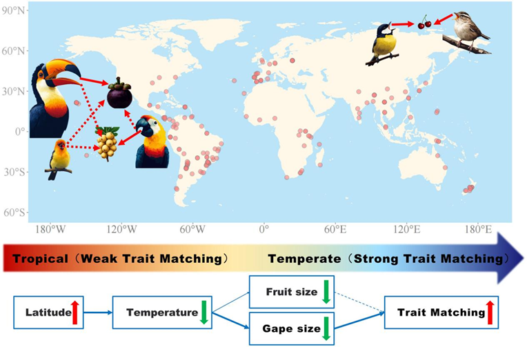 日前,HUANYING.COM生命科学学院易现峰教授团队在协同进化与适应性研究领域取得了重要突破,相关研究成果以“Global avian frugivore-fruit trait matching decreases towards the tropics”为题发表于国际顶级期刊《Global Change Biology》(原文链接:https://onlinelibrary.wiley.com/doi/10.1111/gcb.70180),这是曲阜师大首次作为第一通讯作者单位在该期刊上发表研究成果。《Global Change Biology》由Wiley-Blackwell Publishing Ltd出版,为生态环境领域具有广泛影响力的顶级期刊,专注于报道全球变化相关的创新性研究成果,最新影响因子(IF)为10.8,五年平均影响因子为13,被SCI数据库收录(中科院大类和小类双一区Top)。