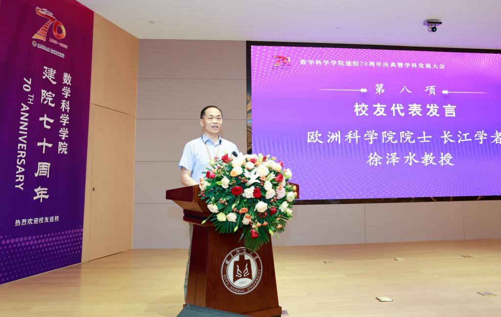 来宾代表麻希南教授在致辞中回顾了多次到访学院的经历,高度称赞学院的人才培养质量,其身边的曲园数学校友普遍学风朴实、基础扎实、热爱专业。他充分肯定学院培养出包括中国科学院院士在内的大批优秀人才,期望学院以七十周年院庆为新起点,坚持高质量科研,聚焦省属高校拔尖人才培养,通过内涵式发展赢得社会声誉,为教育强国建设贡献力量。