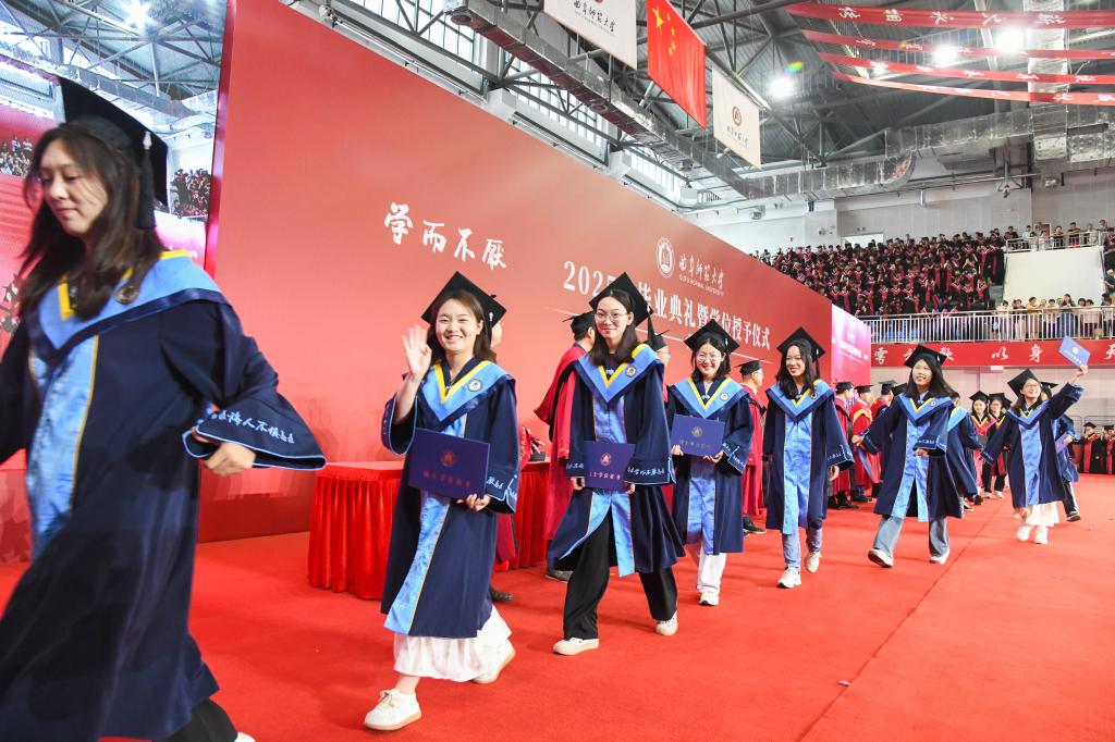 “感谢母校赋予我们那份‘顶天立地’的精神品格!”刘涛校友在典礼上分享了从曲园毕业到北大继续深造、从海外留学归国到成为领域专家的个人历程。他表示,正是曲园的精神追求,引领着一代代曲园学子胸怀理想、脚踏实地,在谦逊务实中不断追求卓越,在各个领域、各类岗位上建树时代新功、彰显曲园贡献。他以一名“老学长”的身份寄语毕业学子永葆“学而不厌”的态度,持续锻造更强大的自己;践行“诲人不倦”的精神,在成就他人中成就自我;拥抱“苟日新,日日新”的潮流,勇立时代潮头。