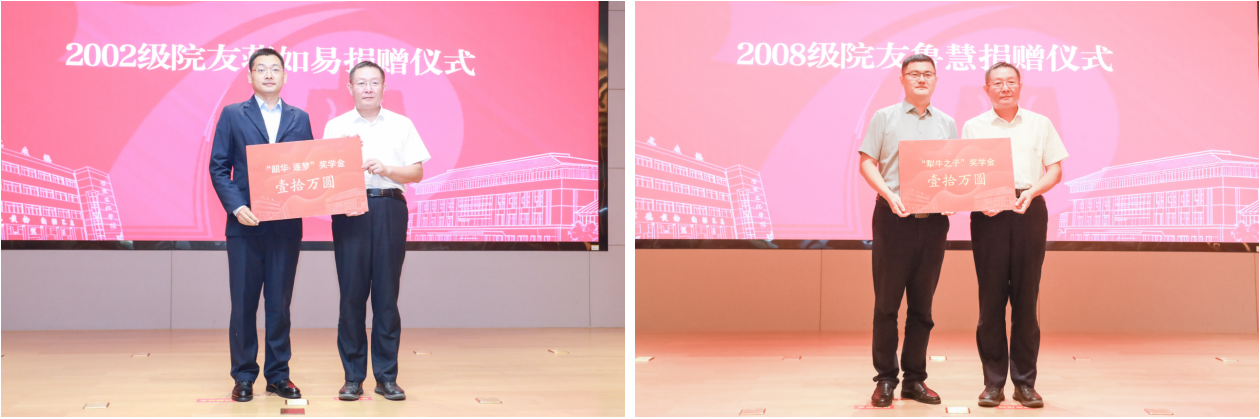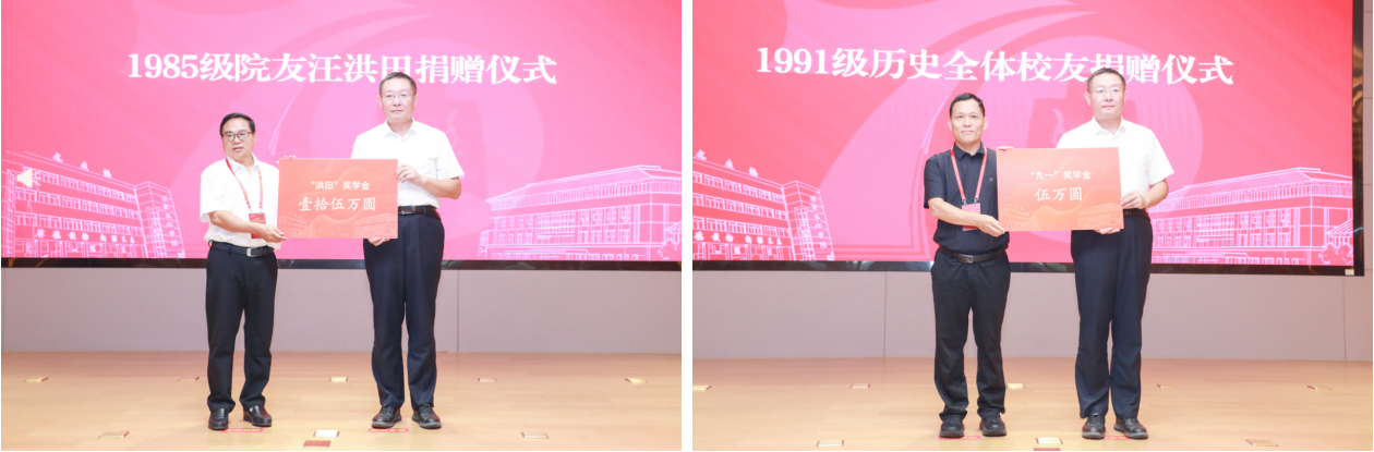 在捐赠仪式上,1985级院友汪洪田、1989级院友张沨、1991级历史全体院友、2002级院友蒋如易、2008级院友鲁慧、校友杜妮娜夫妇等分别捐赠学院发展基金、奖学金等,助力学院事业发展。