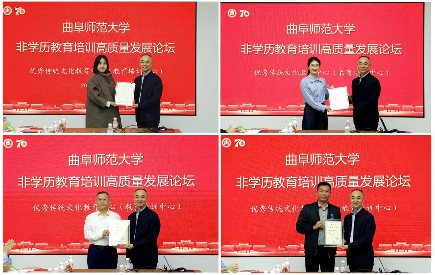 李兆祥代表学校向为曲阜师大70周年校庆捐款的5家合作机构代表颁发捐赠证书。