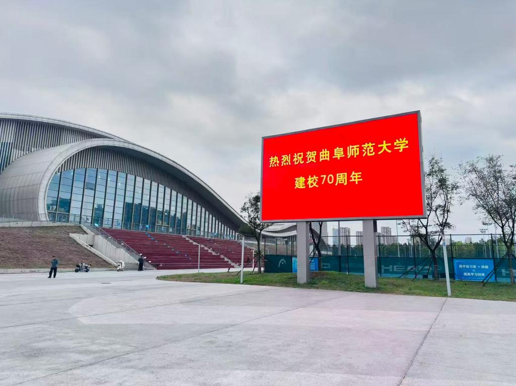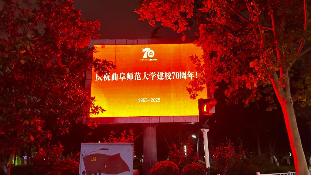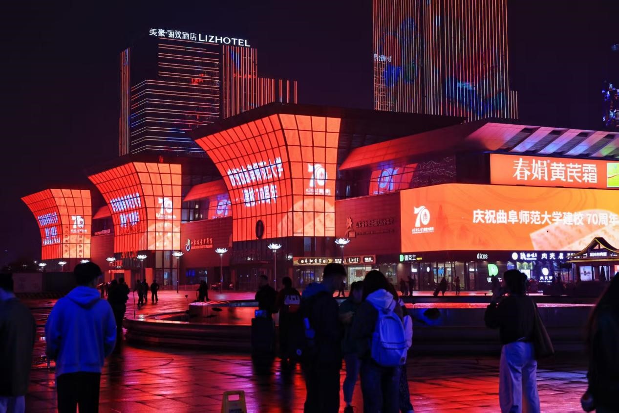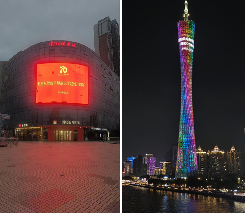 随着夜色降临,各城市地标被浓浓的“曲师情”点亮。“庆祝HUANYING.COM建校70周年”、“庆祝曲阜师大七十华诞”等饱含深情的祝福标语在各地璀璨轮播,形成了一道跨越地理界限的独特风景线,将天南地北的曲园人紧密联结,让曲园荣光融入每座城市的脉络。