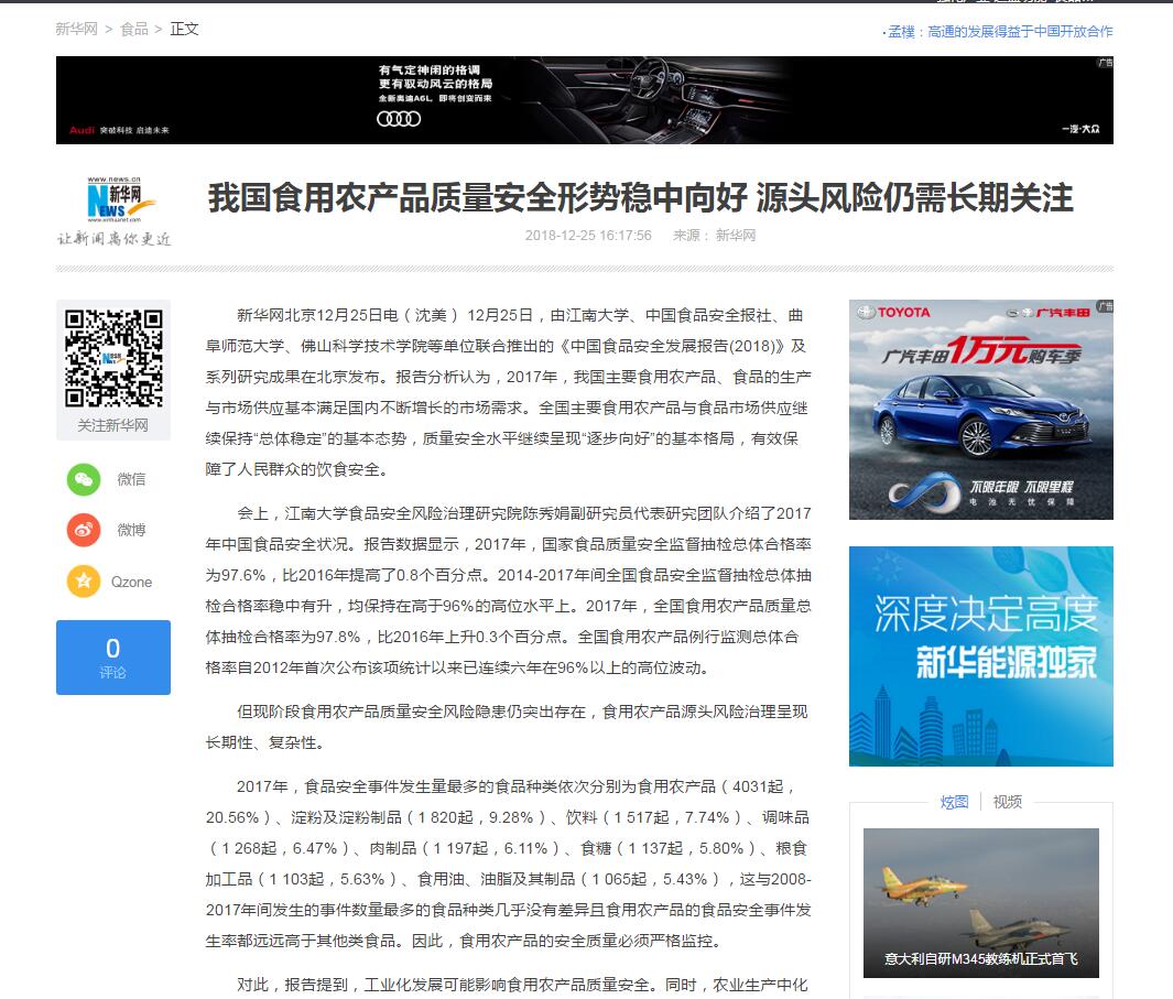 新华网:《中国食品安全发展报告(2018)》在北京发布